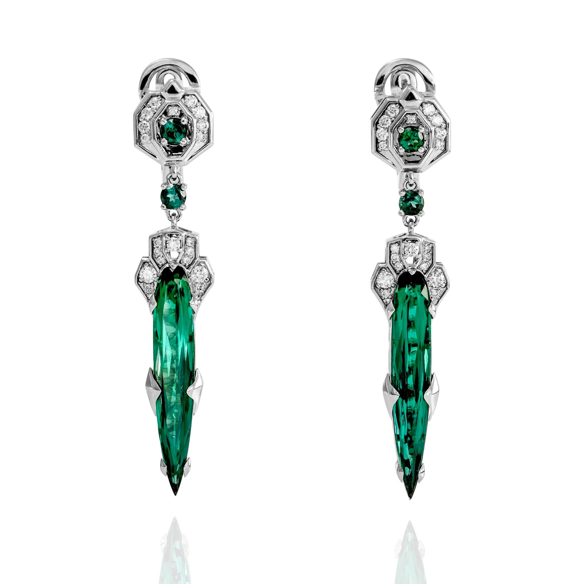 Серьги, Белый | 36 Бр кр-57 0,370Ct 3/5А ,14 Бр кр-57 0,210Ct 4/5А ,10 Турмалин 3,650Ct |